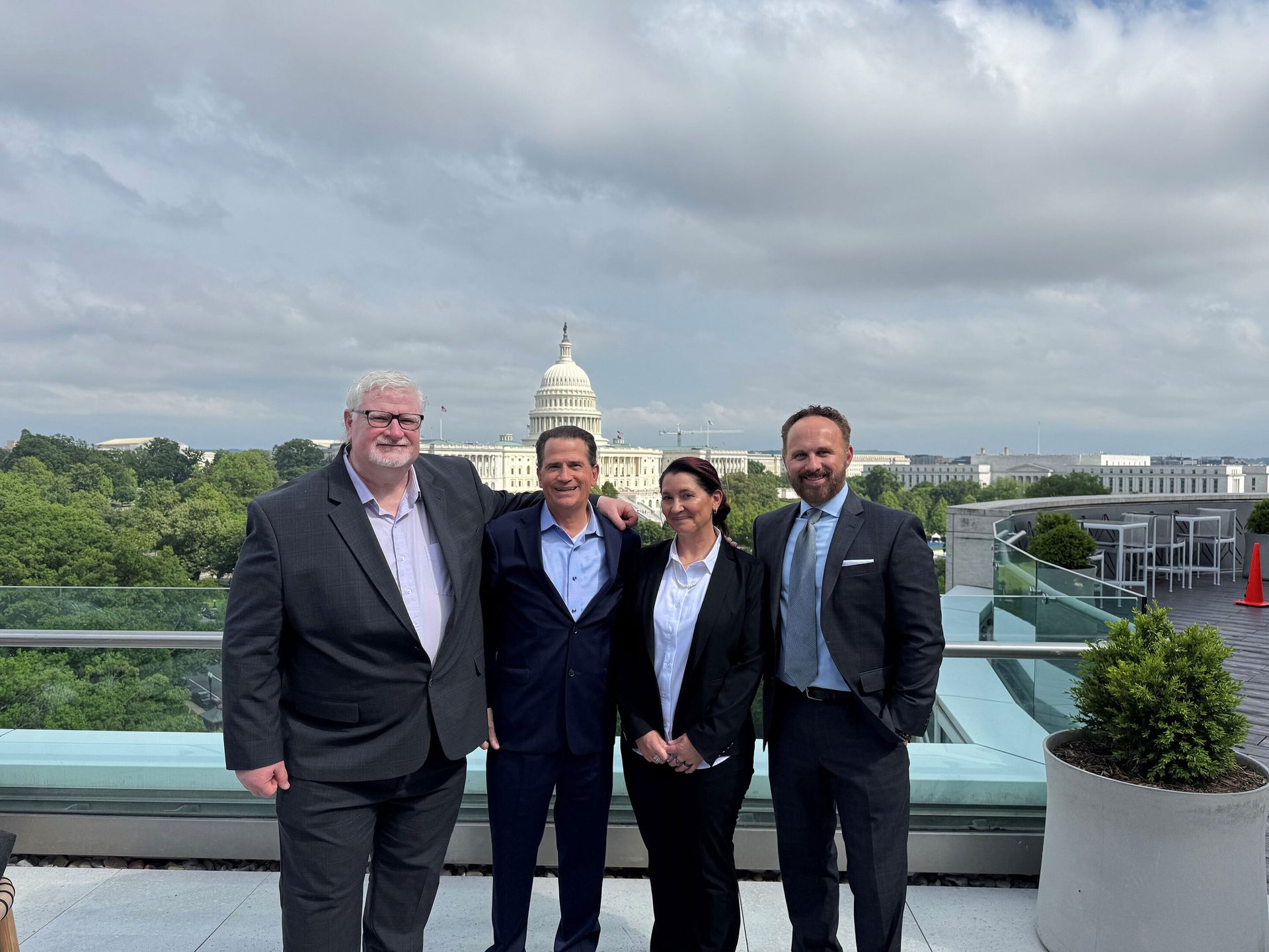Sharing a moment on the IAPMO HQ Deck with industry friends (right to left): Dain Hansen, Exec VP, Govt Affairs IAPMO, Barb Donaldson of Plastic Pipe and Fittings Association (PPFA), (Dan Ashenden), and John Mesenbrink of Mechanical Hub - with our Capitol in the background.